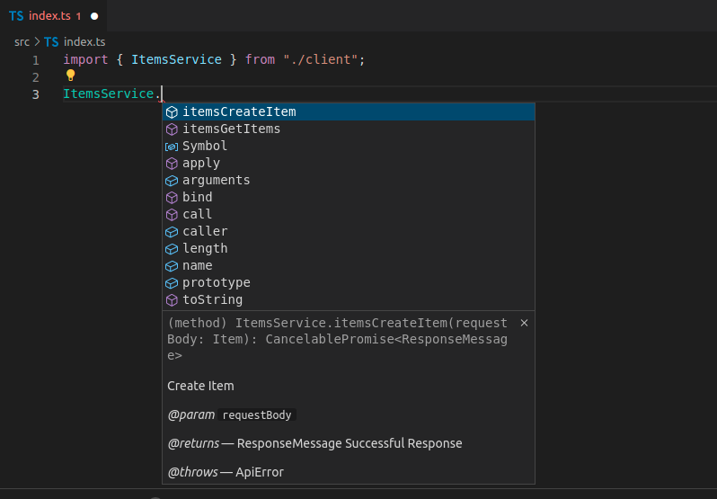 Now you can import and use the client code, it could look like this, notice that you get autocompletion for the methods: